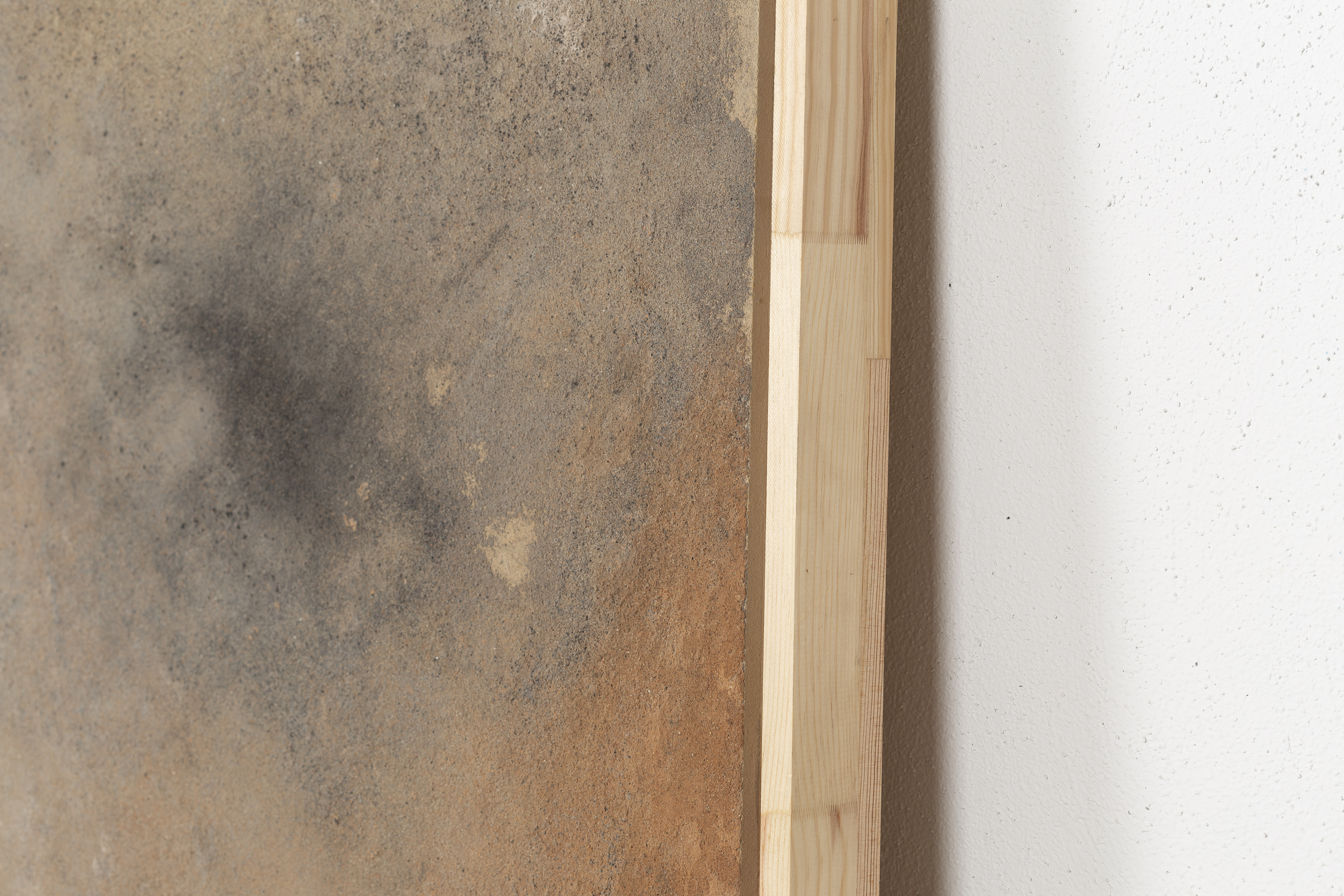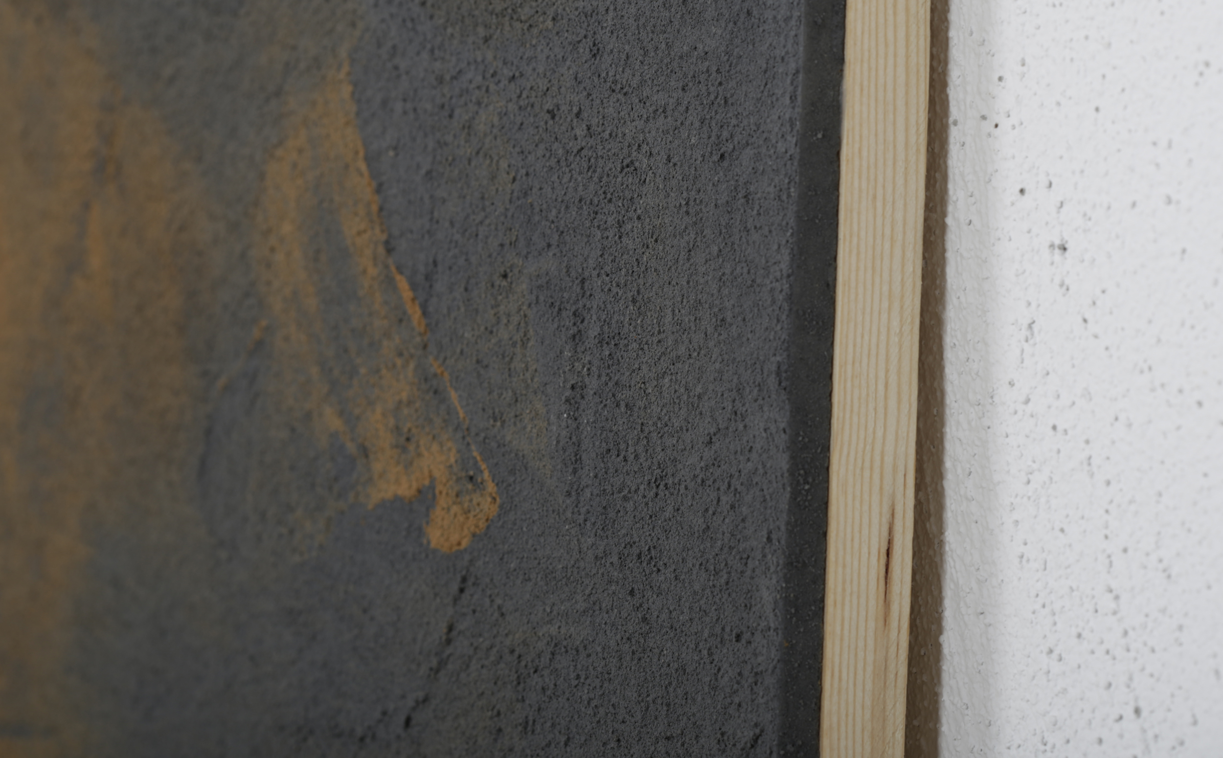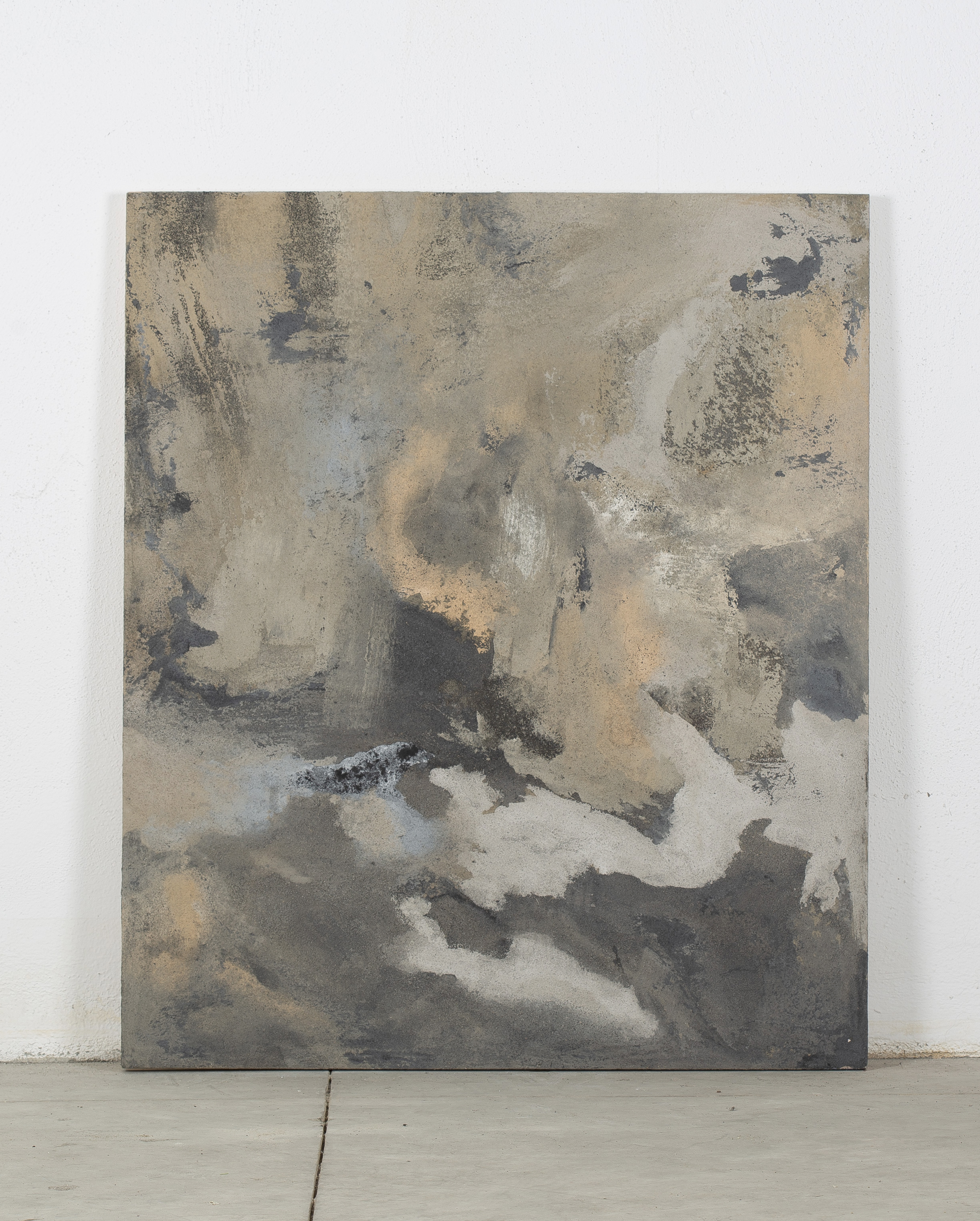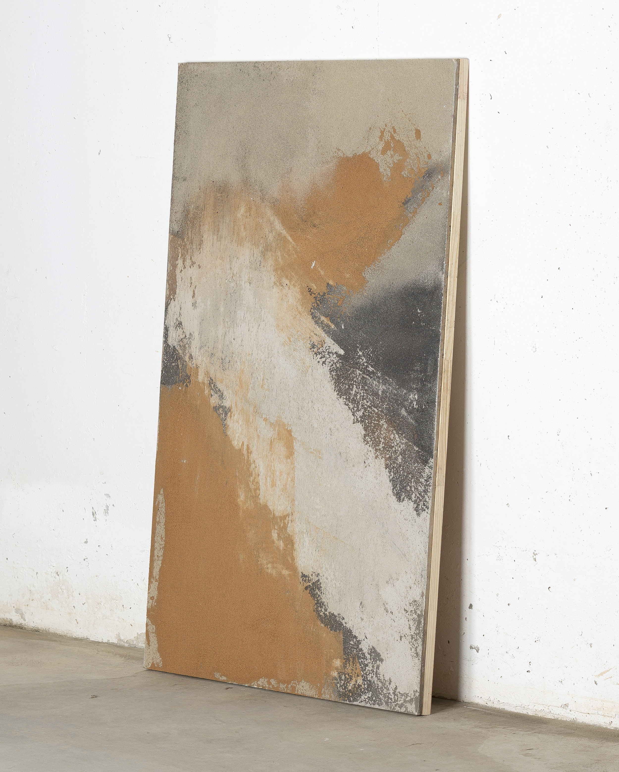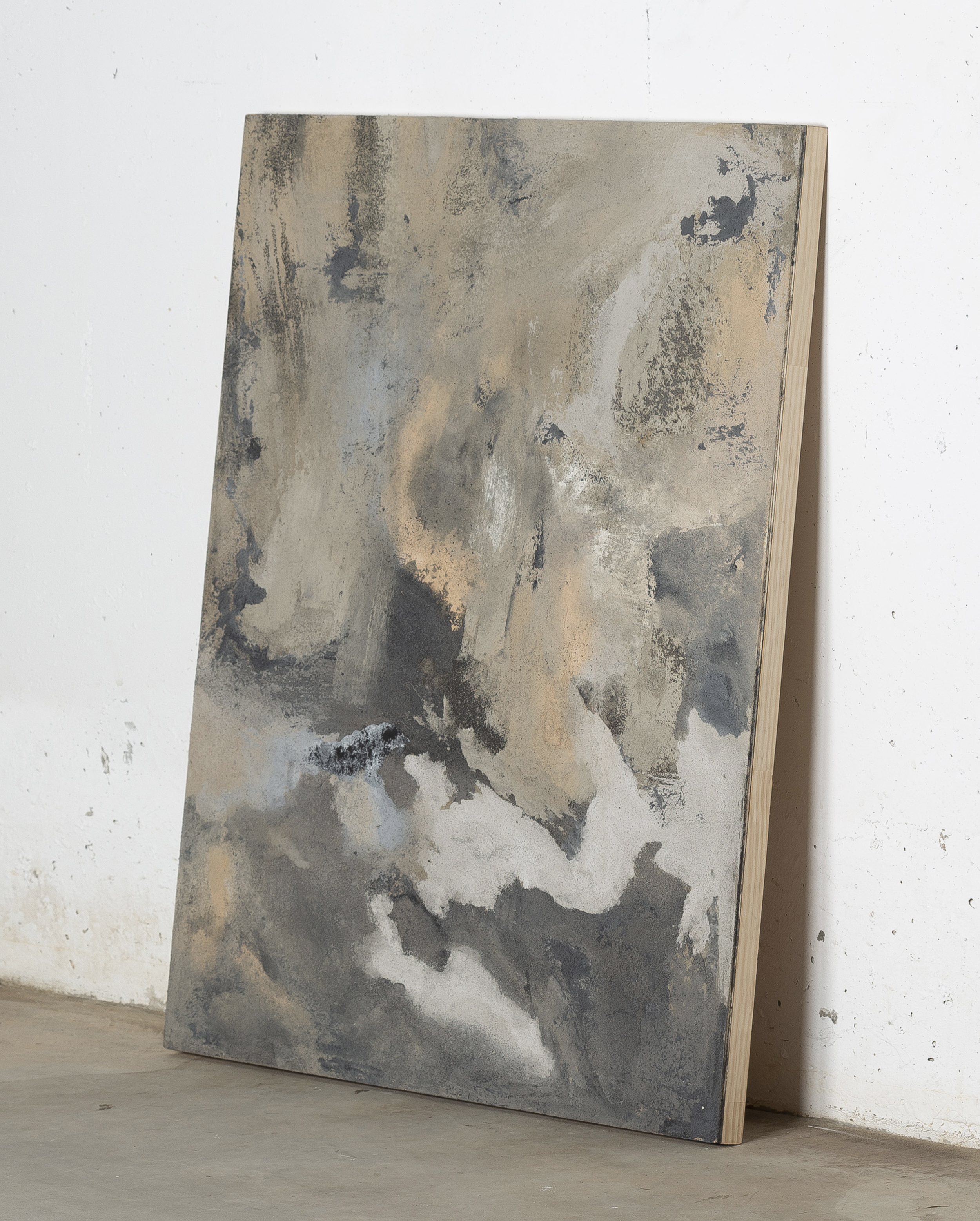 - Mixed media: concrete and natural pigments, made out of stones, sand, charcoal and ashes on a DM board.