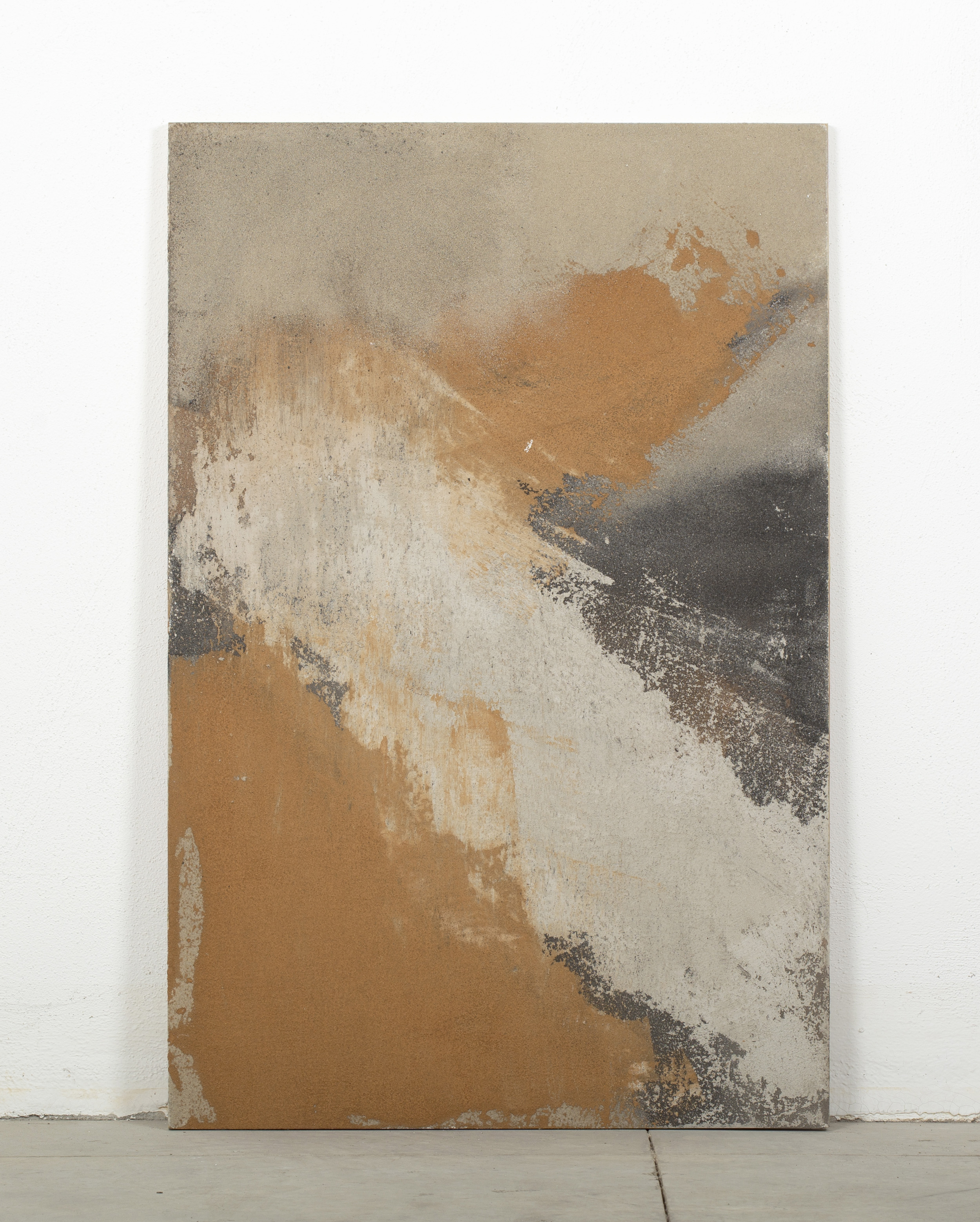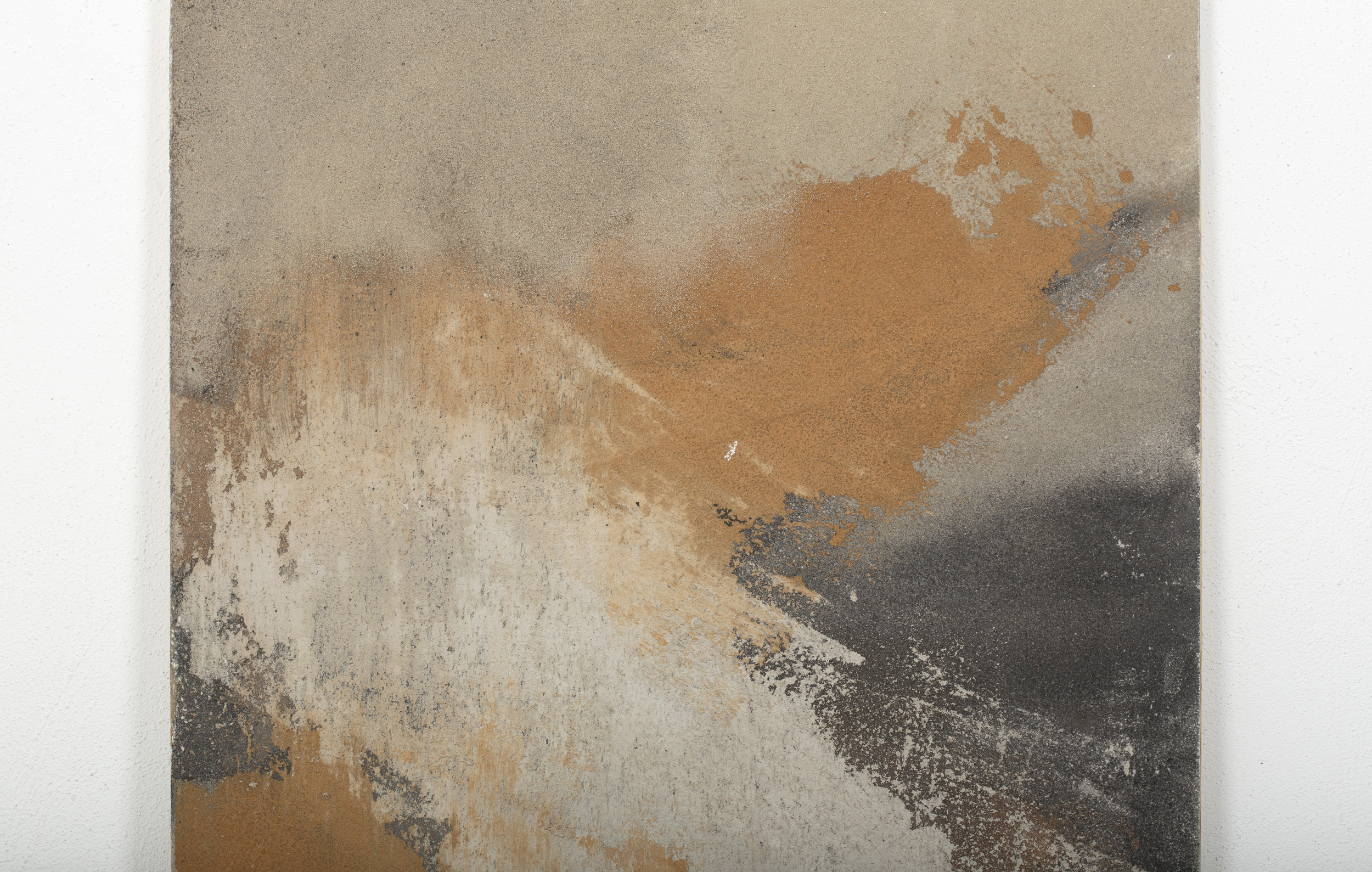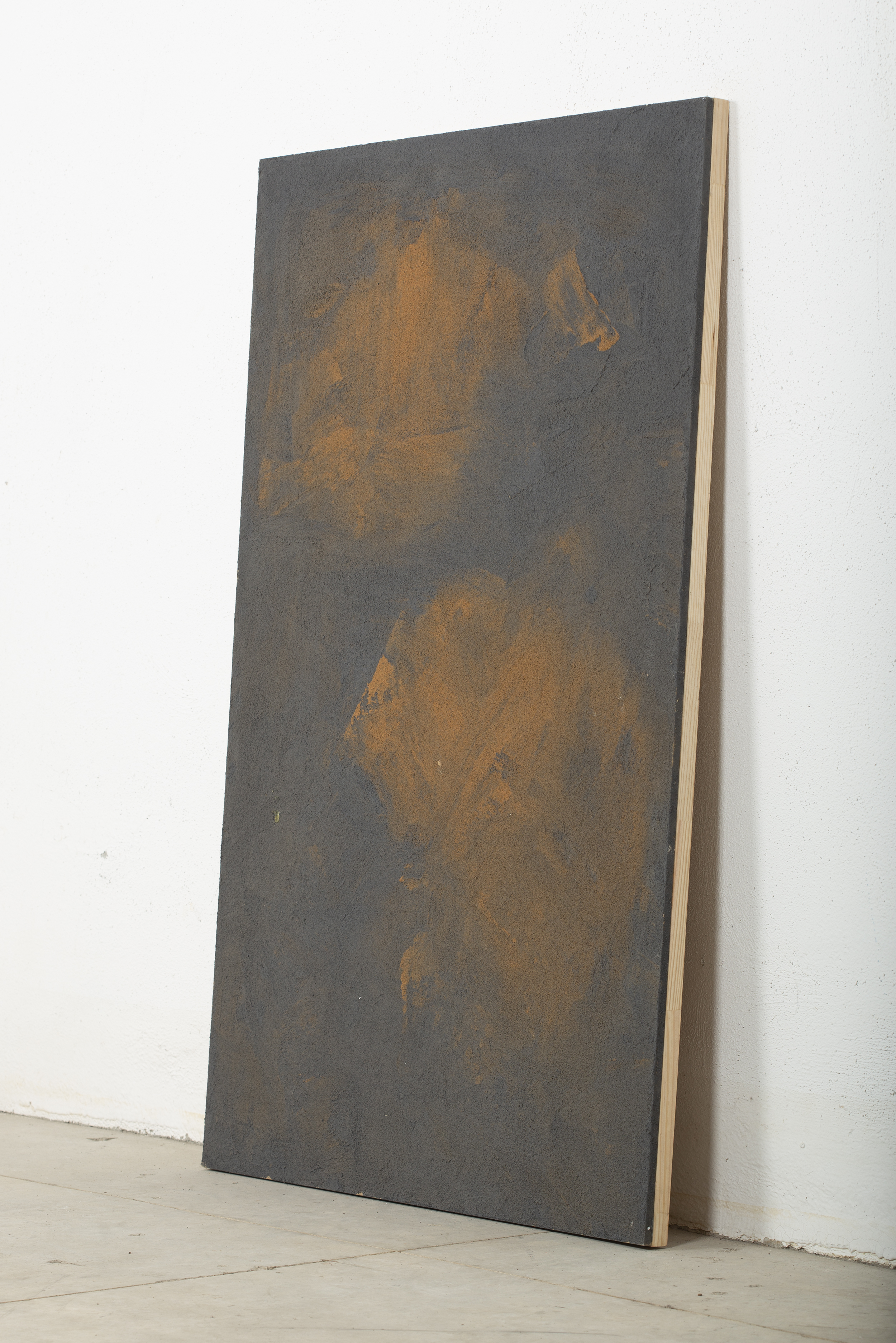 - Mixed technique, concrete and natural pigments, made out of sand, ashes, charcoal and clay on a Calabó board.