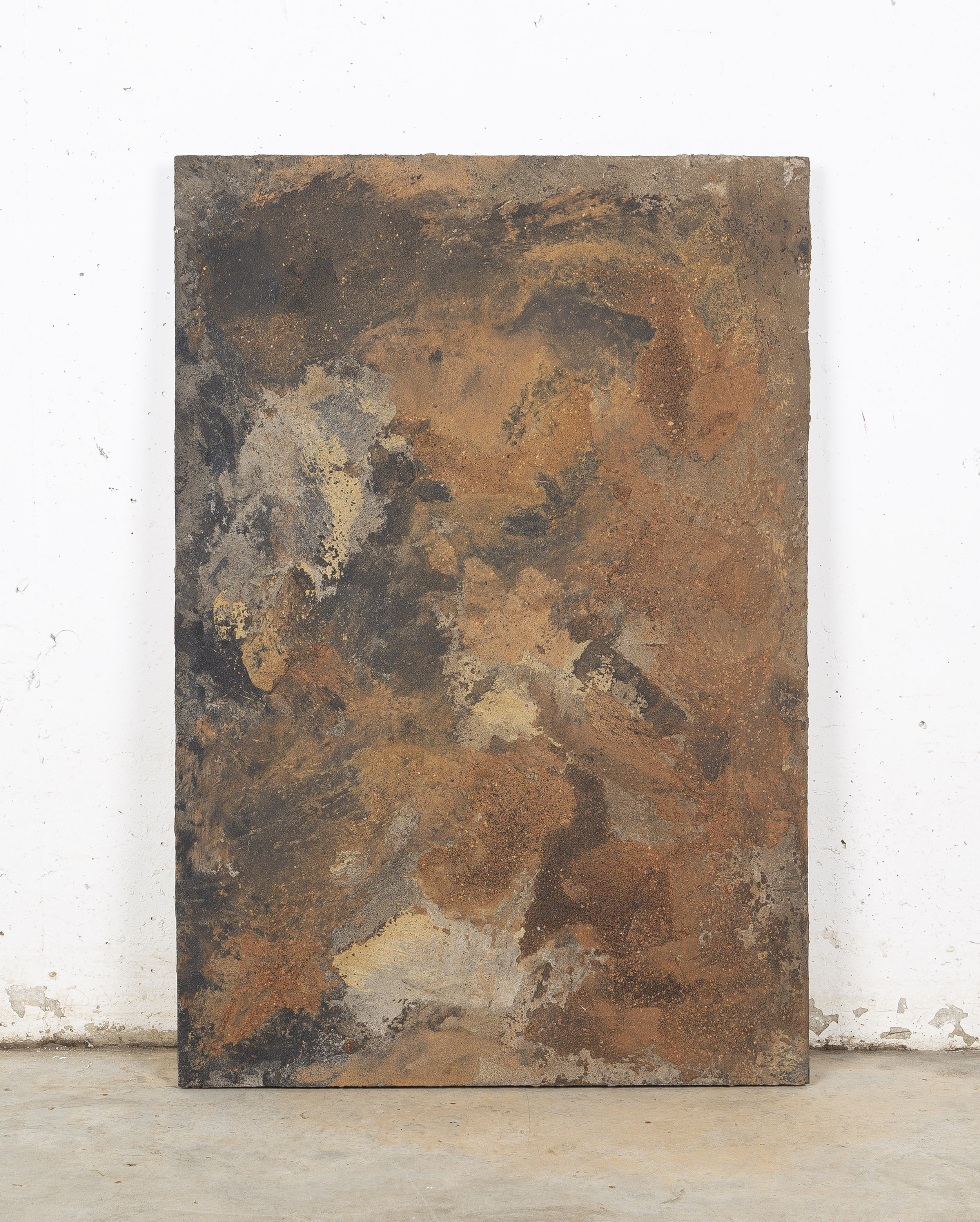 - Técnica mixta, pigmentos naturales hechos con arena, arcilla, tierra, cenizas y carbón sobre tablero de Calabó.